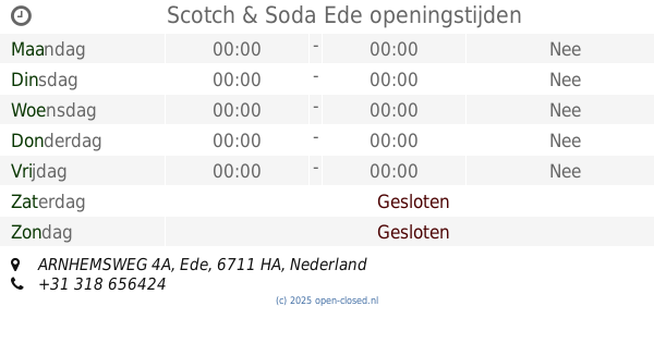 Add it to your website, your phone or even your desktop - opening times, phone numbers and the road to Winkel of the Scotch & Soda In Ede, ARNHEMSWEG 4A.